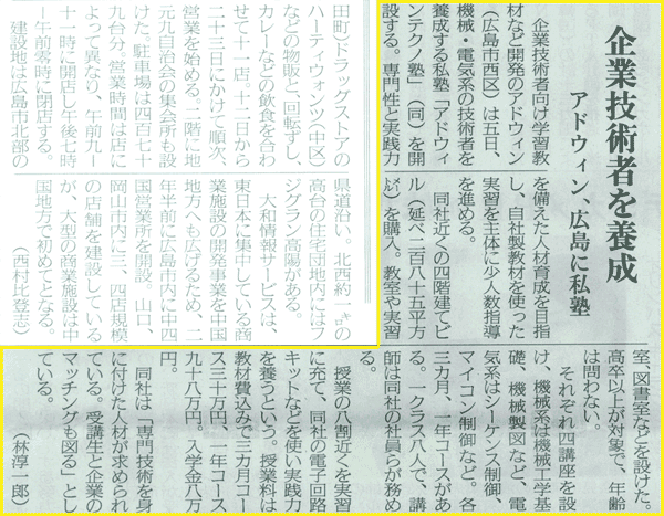 中国新聞に掲載されました『企業技術者を養成 アドウィン、広島に私塾』